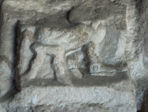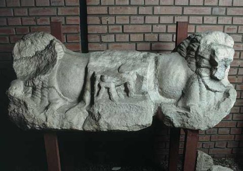 - Zwischen liegenden Löwen kubisches Mittelstück, unten abgestuft, auf der Stufe Schemel mit nach rechts sitzender nackter Figur.