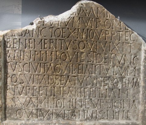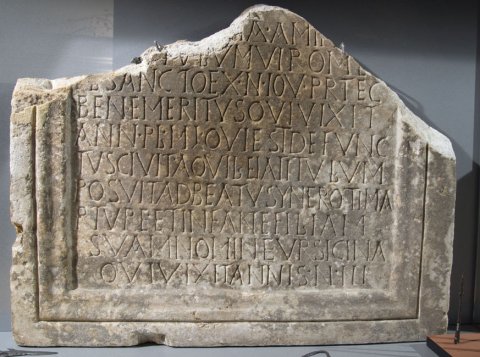 - Ego Aur]elia Aminia po/[sui] titulum viro meo / [F]l(avio) Sancto ex n(umero) Iov(ianorum) pr(o)tec(tori) / bene meritus qui vixit / ann(os) pl(us) m(inus) L qui est defunc/tus civit(ate) Aquileia titulum / posuit ad beatu(m) Synerot<e=I>(m) ma/rture(m) et infan(t)e(m) filiam / suam nomine Ursicina / qui vixit annis n(umero) III