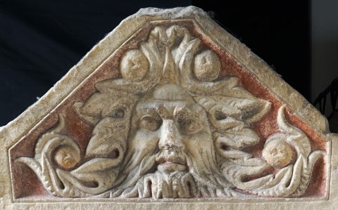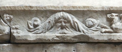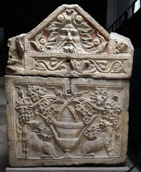 Dachförmiger Deckel, Theatermasken als Eckakrotere, auf der Vorderseite Fries mit Meerwesen (Seegreifen, in der Mitte bärtiger Kopf unter Akanthuskelch). Im Giebelfeld Blattmaske, darunter Fries mit Efeuranke.
