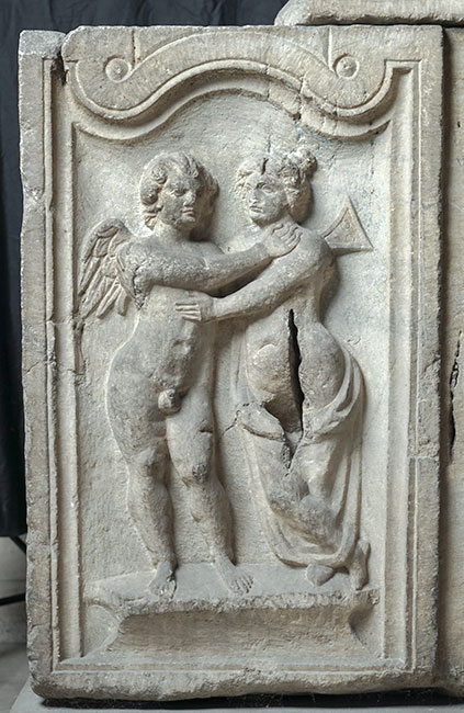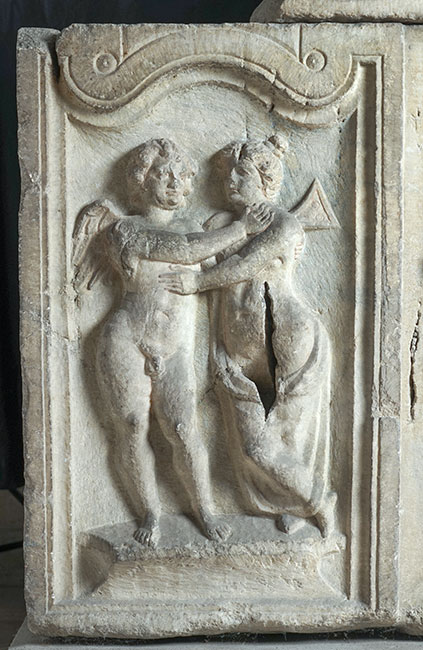 Auf der Vorderseite des Kastens Mythos : Schriftfeld zwischen zwei Nischen mit Amor und Psyche, sich umarmend, auf flachen Postamenten. Oberer Rahmen flach geschwungen mit Volutenenden.