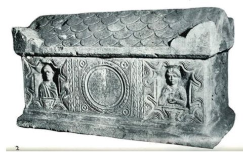 Auf der Vorderseite in der Mitte Inschrift in Medaillon, in den Zwickeln Rosetten.seitlich davon gewellte Vierpassrahmen um Nischen mit Brustbildern (Bruder und Schwester). Links Mann: bärtig, kurzes Haar, Halstuch, Sagum, Scheibenfibel. Rechts Mädchen: Mittelscheitel (Frisur der Fausta ?), Ärmeltunica, Mantel, Halskette, in der Linken Frucht.