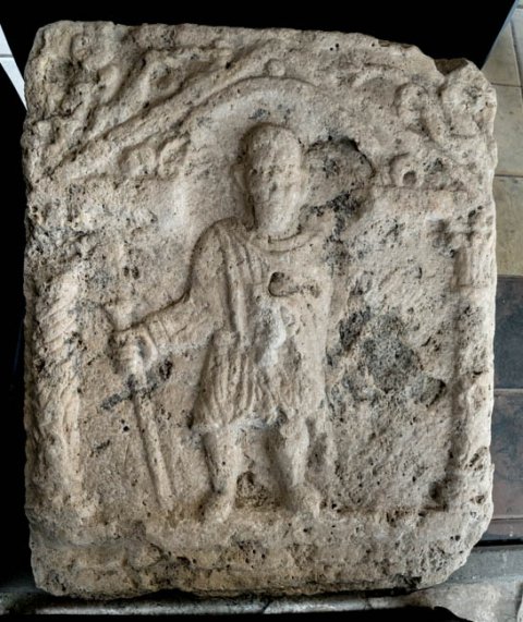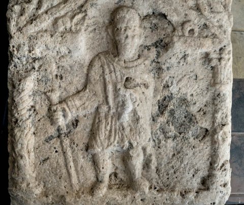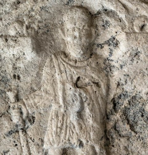 Im Hauptbild zwischen Säulen mit Spiralkanneluren stehende Ganzfigur eines Mannes (Soldat, Centurio): kurze Tunica, Sagum. Waffen: Schwert, Stock (vitis).