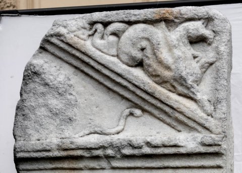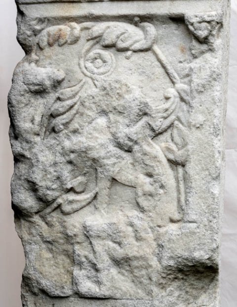 Eingeschriebener Giebel mit Gorgoneion, auf den Schrägen Meerwesen (Seegreif).
