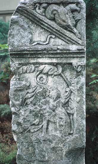 Im Hauptbild außen Säulen, oben Akanthusstängel mit Blüte, in der Mitte Gefäß (?) mit Pflanze zwischen hockenden geflügelten Greifen. - Inschrift