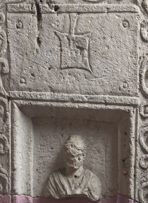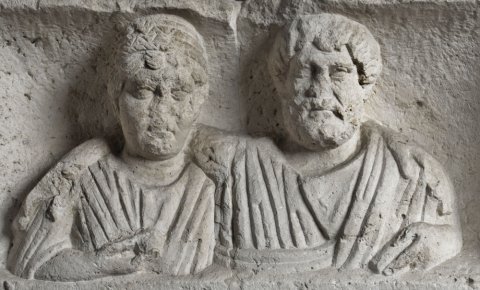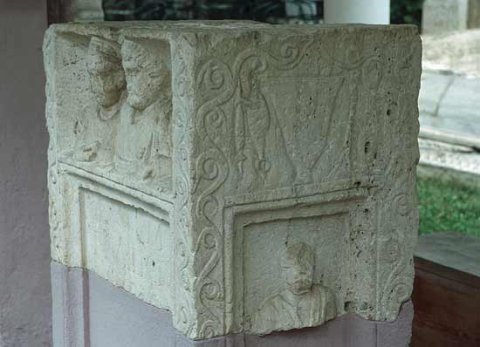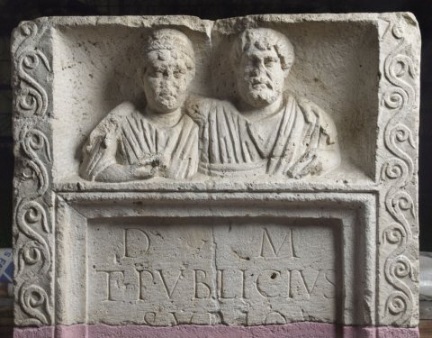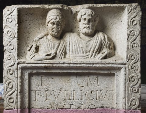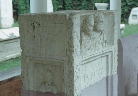 Auf der Vorderseite in Rechtecknische über dem Schriftfeld zwei Brustbilder (Ehepaar). Links Frau: Frisur der Faustina Maior, Tunica, Mantel. Rechts Mann: bärtig, Locken,Tunica, Toga, in der Linken Rolle (volumen). Auf den seitlichen Rahmenleisten Spiralranken.