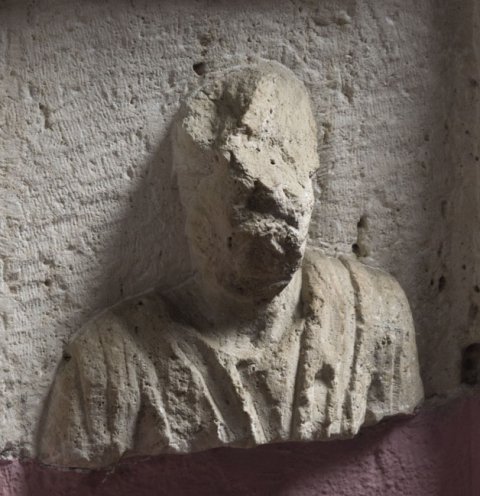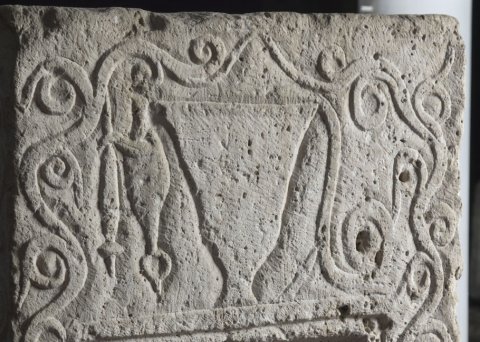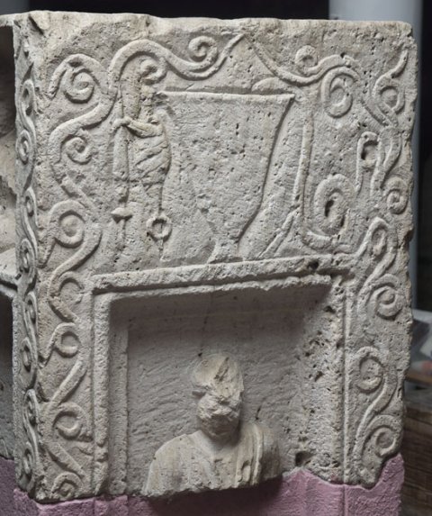 Auf der rechten Nebenseite in Rechtecknische Ganzfigur (?) eines Mannes in Tunica und Toga. Auf dem oberen Rahmen großer Kelch, links davon Spindel. Auf dem seitlichen Rahmen Spiralranken. - Inschrift