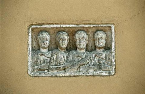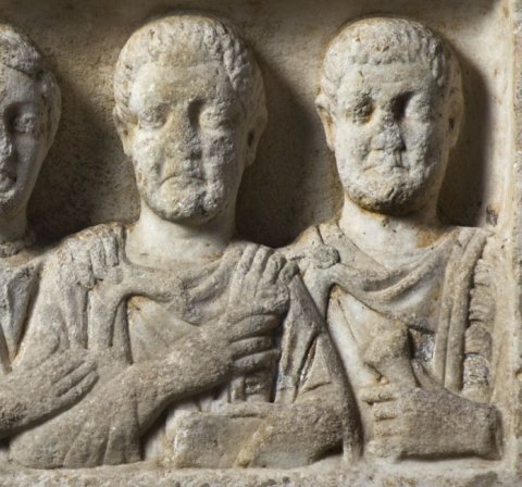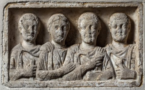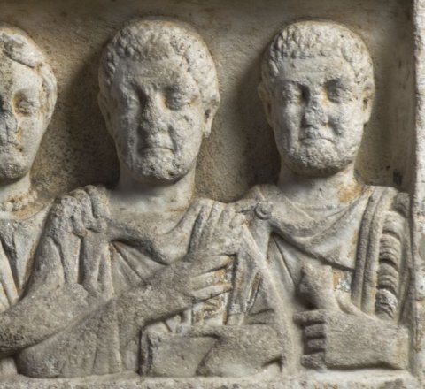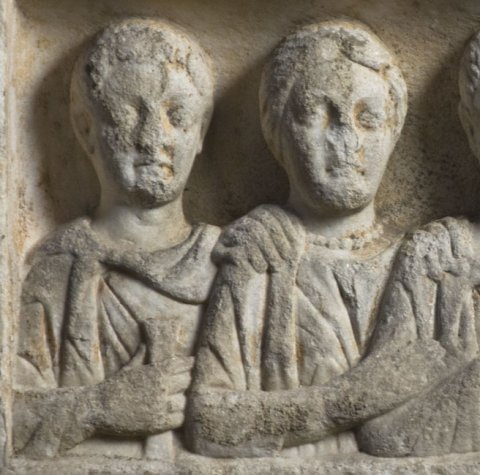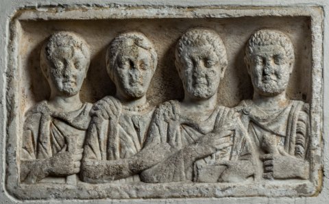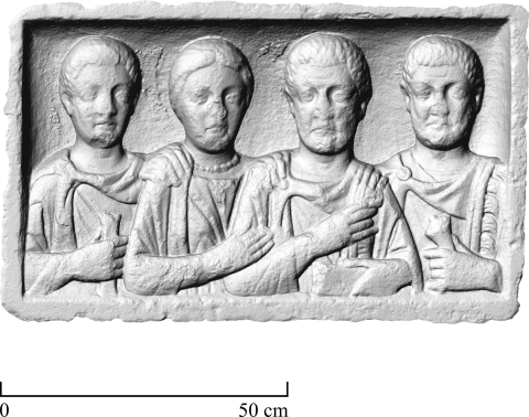 - In Rechtecknische vier Brustbilder einer Familie. Von links: Jüngling: bartlos, Ärmeltunica, Sagum, Scheibenfibel, in der Rechten Rolle (volumen). Frau: Mittelscheitel, Haarnetz, Tunica, Mantel, Halskette. Mann: bärtig, Ärmeltunica, Sagum mit Fransen, Scheibenfibel, in der Linken Diptychon. Mann (Soldat): bärtig, Sagum mit Fransen, Scheibenfibel. Waffen: in der Linken Schwert mit Adlerkopfgriff (?).