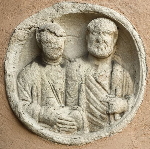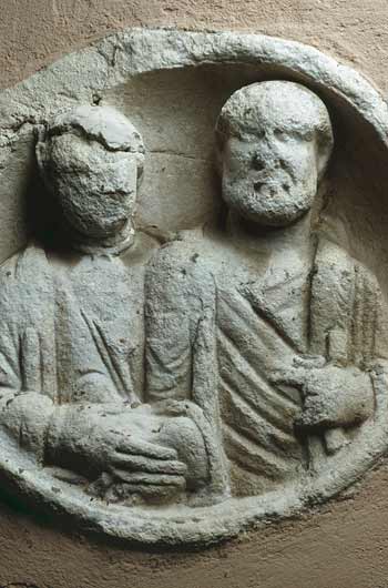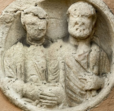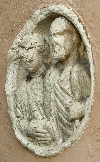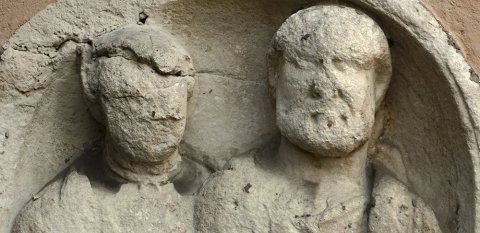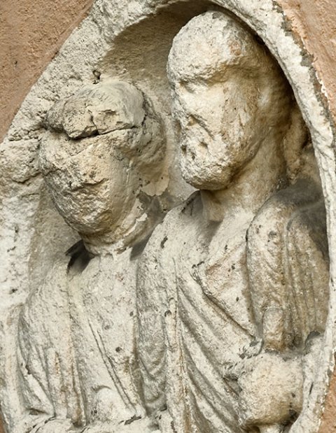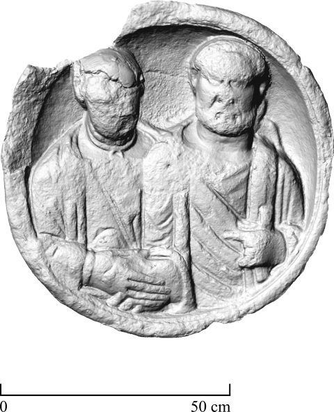 - Zwei Halbfiguren (Ehepaar). Links einheimische Frau: Haube (?), Umhang, Halsreif mit Lunula, Armreif. Rechts Mann (Soldat ?): bärtig, Ärmeltunica, Sagum mit Fransen, Fingerring, in der Linken Rolle (volumen).