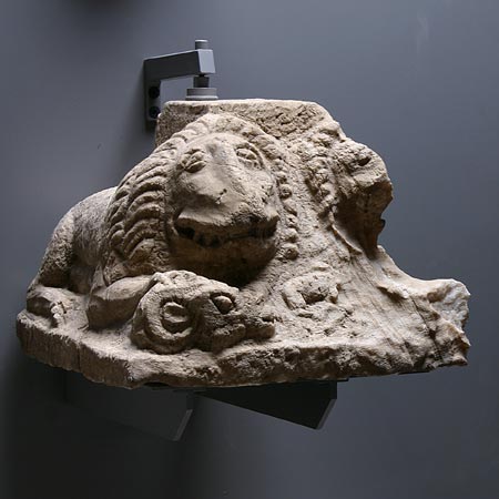 - Pyramidenstumpf, zwischen liegenden Löwen mit Widderköpfen in den Pranken.