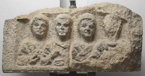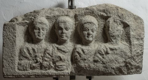- Vier Brustbilder einer Familie. Zwei Frauen in Ärmeltunica und eng anliegender Haube, die Linke mit Blüte in der rechten Hand. Zwei Männer, der besser erhaltene bartlos und mit eckigem Objekt in den Händen, beide in Ärmeltunca und Sagum.
