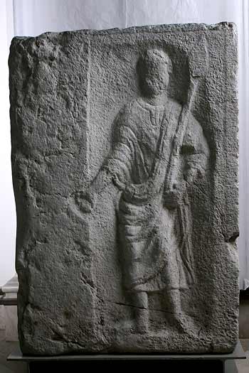 Eckblock: auf der Vorderseite Lictor (?): in ungerahmtem, leicht eingetieftem Rechteckfeld stehender Mann in Tunica und Toga, im linken Arm zwei Stäbe mit blattförmigen Enden .