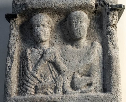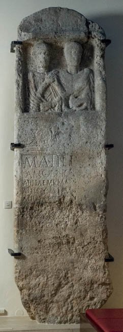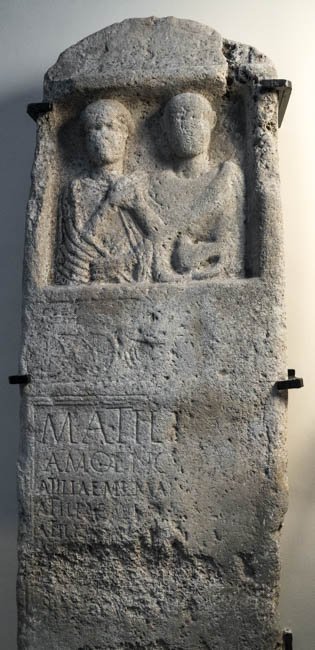Im Hauptbild in Rechtecknische zwei Halbfiguren (Ehepaar). Links einheimische (?) Frau: Umhang, Torques (?), Armreif. Rechts Mann: Toga (?), in der Linken Rolle (volumen).