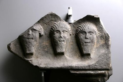 - Familie: drei frontale Köpfe. Frau mit Halsreif. Männer bartlos, glattes Haar. Unterhalb der Bildnische Rest eines profilierten Rahmens.