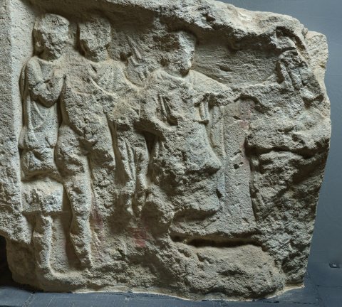 Auf der Rückseite Mythos (?): links senkrechte Rahmenleiste, anschließend 2 stehende aneinander gelehnte Jünglinge (der Linke in kurzer Tunica, der Rechte nackt bis auf Mantel über den Schultern, Reste von 2 Speeren in der Linken ?). Vor ihnen Mann in langem Gewand und Mantel, linker Arm vorgestreckt. Der Reliefrest rechts wird als verschleierte Frau gedeutet. Orest und Pylades auf Tauris ? Deutung auf Orpheus und Eurydike unwahrscheinlich.