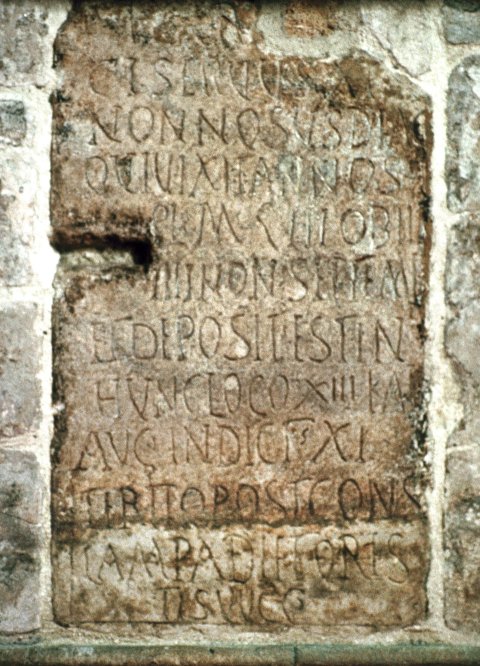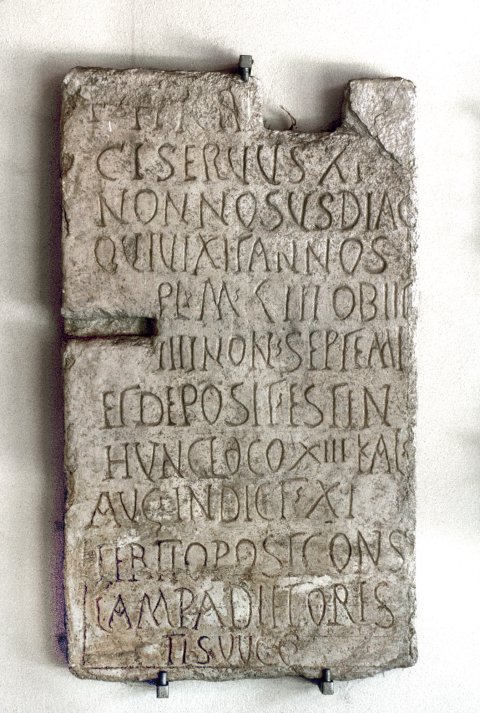 - + Hic re[quies]/ci(t) servus Xr[i](stou?) / Nonnosus diac(onus) / qui vixit annos / pl(us) m(inus) LIII obiit / IIII Non(as) Septemb(res) / et deposit(us) est in / hunc(!) loco XIII Kal(endas) / Aug(ustas) indict(ione) XI tertio post cons(ulatum) / Lampadi et Ores/tis v(irorum) c(larissimorum)