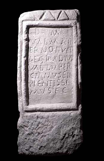 - D(is) M(anibus) / Val(erio) Mat/erno vet(erano) / leg(ionis) II adiut(ricis) / Val(erius) Luper/cianus fil(ius) / pientissi/mus f(aciendum) c(uravit)