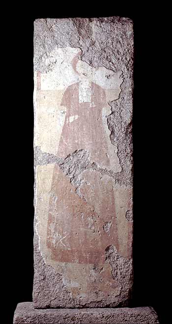 - Frontal stehende Ganzfigur einer einheimischen Frau: Haube, Ober- und Untergewand, Umhang, Flügelfibeln, Gürtel, Torques, Schuhe. In der Rechten Blüte.