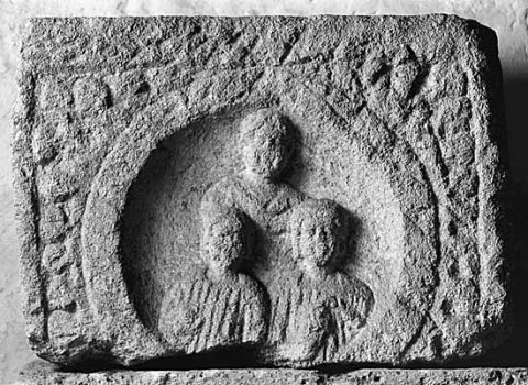 - Medaillon mit drei Brustbildern einer Familie. In der Mitte Frau (?) oder bärtiger ? Mann (?). Davor zwei Kinder (Mädchen ?) in Ärmeltunica, das linke mit Apfel (?) in der rechten Hand, das rechte mit ?