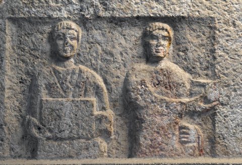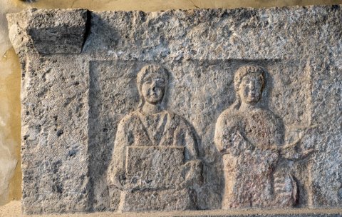 Auf der linken Seitenwand in leicht vertieftem Rechteckfeld zwei Diener, beide in Ärmeltunica, der linke hält großen Behälter vor der Brust, der rechte präsentiert etwas mit nach rechts hin gestreckten Händen.