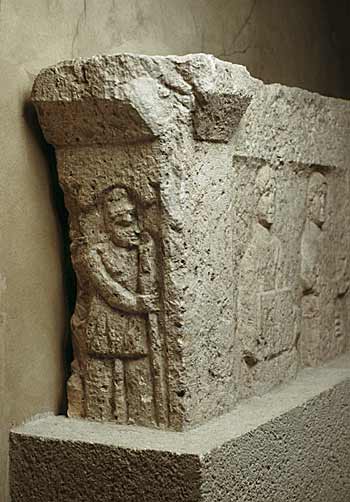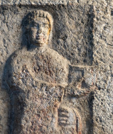 Auf der vorderen, pfeilerartigen Schmalseite mythische Figur : Attis mit phrygischer Mütze, gegürteter Tunica, auf Hirtenstab (Pedum) gestützt. Als oberer Abschluß Bogen mit Volutenenden, darüber vorspringendes Gesims. - Kommentar