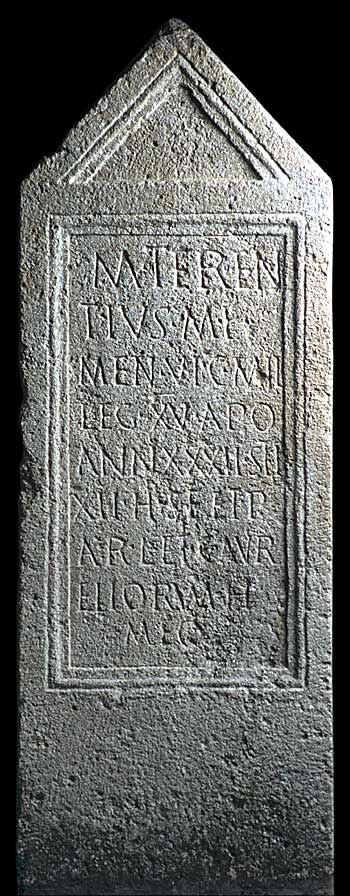 - M(arcus) Teren/tius M(arci) f(ilius) / Men(enia) Vic(etia) mil(es) / leg(ionis) XV Apo(llinaris) / ann(orum) XXXII sti(pendiorum) / XII h(ic) s(itus) e(st) e(x) t(estamento) p(ositum) / ar(bitratu) L(ucii) et C(ai) Aur/eliorum h(eredum) meo(rum)