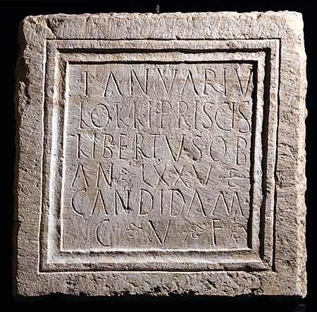 - Ianuarius / Lolli(i) Prisci / libertus ob(itus) / an(norum) LXXV / Candida ma(rito) / c(arissimo) v(iva) f(ecit)