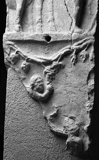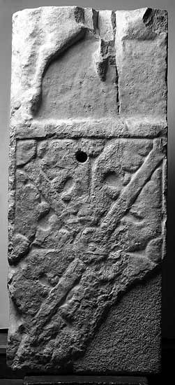 Auf der Rückseite Reiter (?): unten Rechteckfeld mit diagonalem Gitter und Akanthusblattornament, oben Reliefrest einer Reiterdarstellung ? - Kommentar