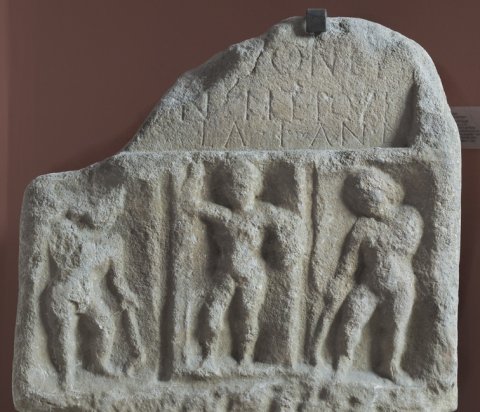 - Mythische Figur (Mars ?, Heros ?), Genius: dreiteiliges Sockelbild, in der Mitte Mann mit Helm und Lanze zwischen zwei nacckten Knaben mit gesenkter Fackel (Trauergenius).