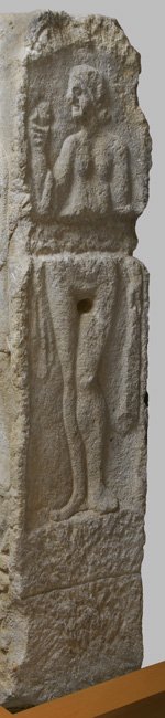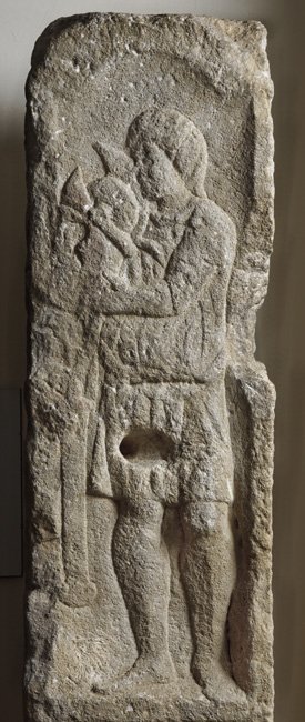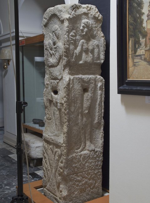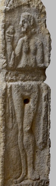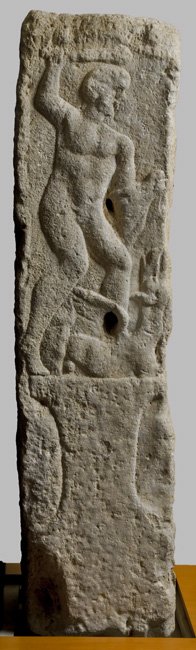 Auf der Vorderseite in Bogennische Ganzfigur eines Mannes (Soldat): Kappe oder langes Haar (?), kurze Tunica mit Gürtel (Ringschnalle ?), um den Hals Torques (?) und darunter Kette aus viereckigen Gliedern (?). Waffen: an der rechten Seite Langschwert in Scheide mit Dosenortband, in den Händen Helm mit Nackenschutz und Wangenklappen und fragliches Objekt. Unter der Standleiste Pflanzenkelch.
