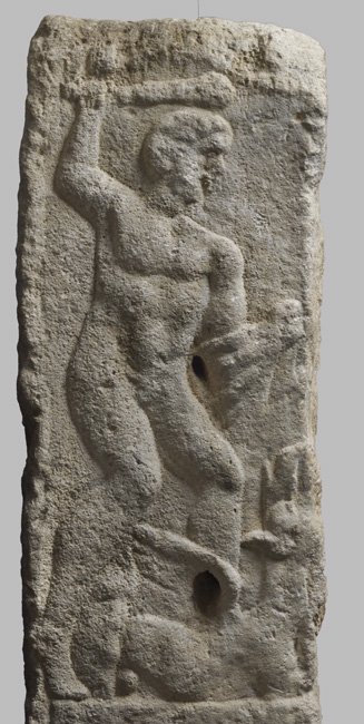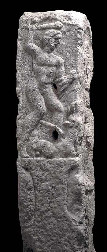 Auf der linken Nebenseite Mythos : auf hohem Podest nackter Herakles (Hercules) mit erhobener Keule, Mantel (Löwenfell ?) um linken Arm. Er steht über einem Felsen, vor dem ein hundeköpfiges Tier liegt (Kerberos-Cerberus ?).
