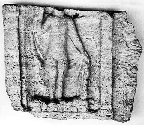- Linkes Seitenfeld einer Inschrift ? Mythische Figur (Venus, Andromeda oder Hesione ?): auf Wellen oder Felsgrund (?) stehende nackte Frau, die mit beiden Händen ihren Mantel hinter sich ausbreitet. Rechts unten Seeungeheuer. Links Pilaster, rechts Halbsäule und Rest eines gewellten Rahmens.
