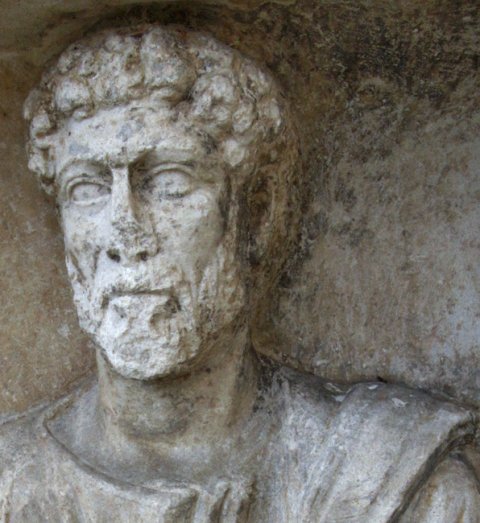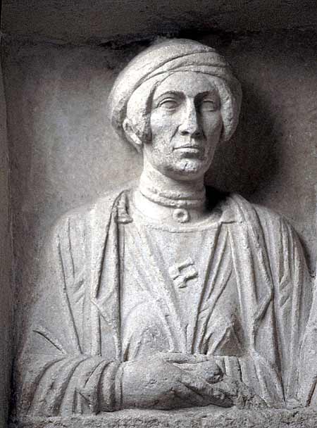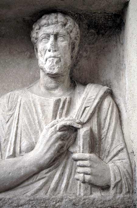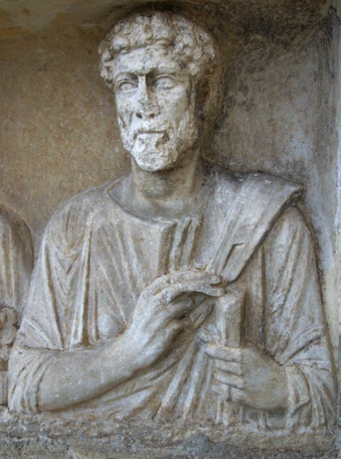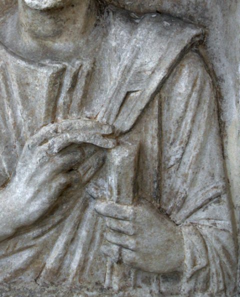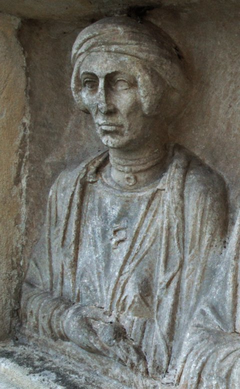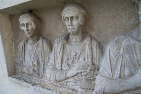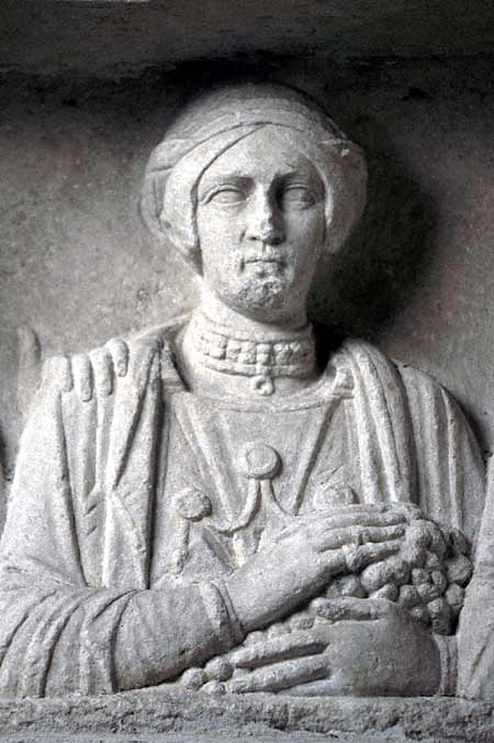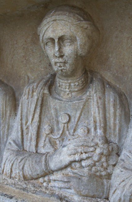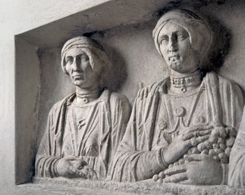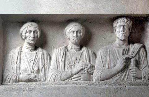- In Rechtecknische drei Brustbilder einer Familie. Links einheimische Frau: Haube, Umhang, Doppelknopffibeln, auf der Brust als Brosche zwei Kniefibeln, Halsbänder, Lunula-Anhänger, Armreif, in den Händen Spindel. In der Mitte junge einheimische Frau: Haube, Umhang, Flügelfibeln, Brustschmuck mit drei Scheiben, zwei Perlenketten, zwei Halsreifen, Lunula-Anhänger, Armreif, in den Händen Weintraube. Rechts Mann: bärtig, Locken, Tunica, Toga mit Borte (?), Fingerring, in der Linken Rolle (volumen).