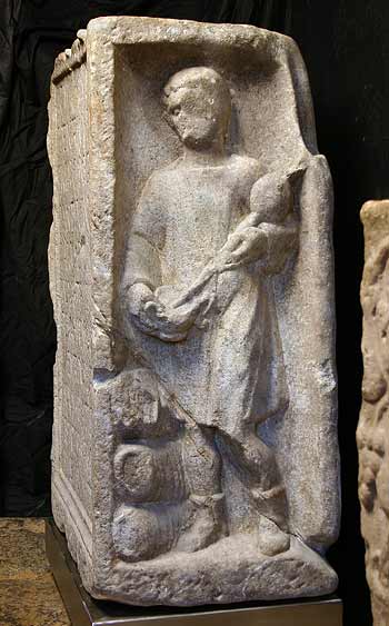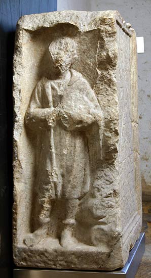Auf der linken Nebenseite Mann (Diener): Tunica, Paenula, Stiefel, in den Händen Korb (?), neben dem Fuß Fässer.