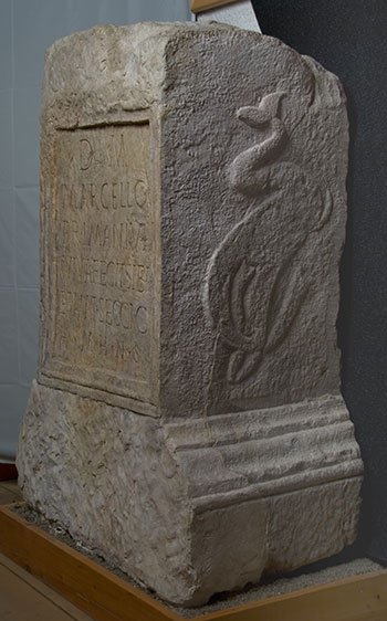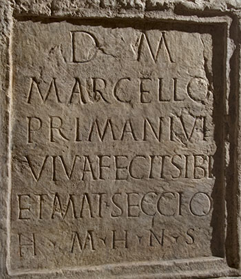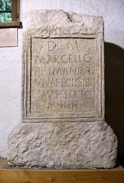 - D(is) M(anibus) / Marcello / Prima Nivi (filia) / viva fecit sibi / et Mat(tio) Seccio / h(oc) m(onumentum) h(eredem) n(on) s(equetur)