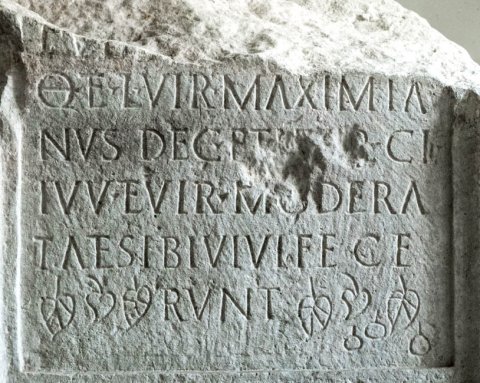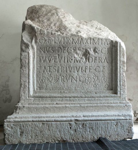 - L(ucius)(?) Vir(ius) [---] / (obit-) et L(ucius) Vir(ius) Maximia/nus dec(urio) et IIvir Cl(audi) / Iuv(avi) et Vir(ia) Modera/ta et sibi vivi fece/runt