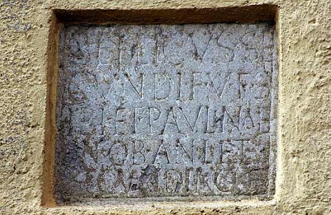 - Bellicus Se/cundi f(ilius) v(ivus) f(ecit) s/ibi et Paulinae / con(iugi) ob(itae) an(norum) L et / Secundino f(ilio)