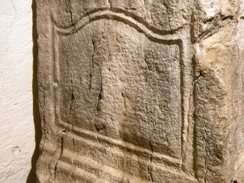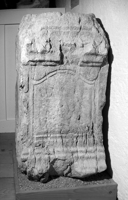 - gerahmtes Schriftfeld, auf den Nebenseite gerahmte leere Felder mit flachem Bogen an der Oberseite