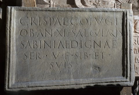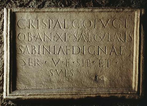 - Crispae co(n)iugi / ob(itae) an(norum) XL Saecularis / Sabiniae Dignae / ser(vus) v(ivus) f(ecit) sib(i) et / suis