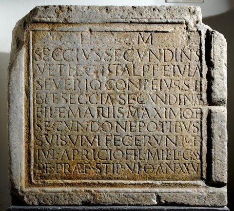 - D(is) M(anibus) / Seccius Secundinus / vet(eranus) leg(ionis) II Ital(icae) p(iae) f(idelis) et Iulia / Severio coni(unx) eius si/bi et Secciae Secundinae / fil(iae) et Mariis Maximo et / Secundo nepotibus / suis vivi fecerunt et / Iul(io) Apricio fil(io) mil(iti) leg(ionis) s(upra)s(criptae) / b(ene)f(iciario) praef(ecti) stip(endiorum) VI o(bito) an(norum) XXV