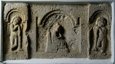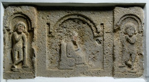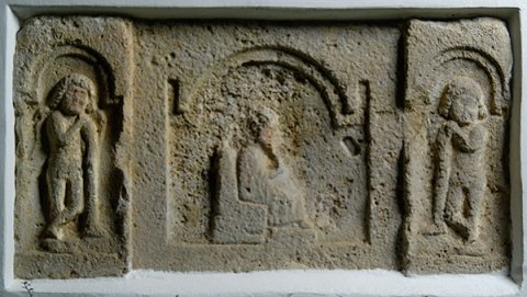 - In rundbogig gerahmtem Mittelfeld sitzende Frau auf Lehnsessel. In den Seitenfeldern Trauergenius mit gesenkter Fackel.