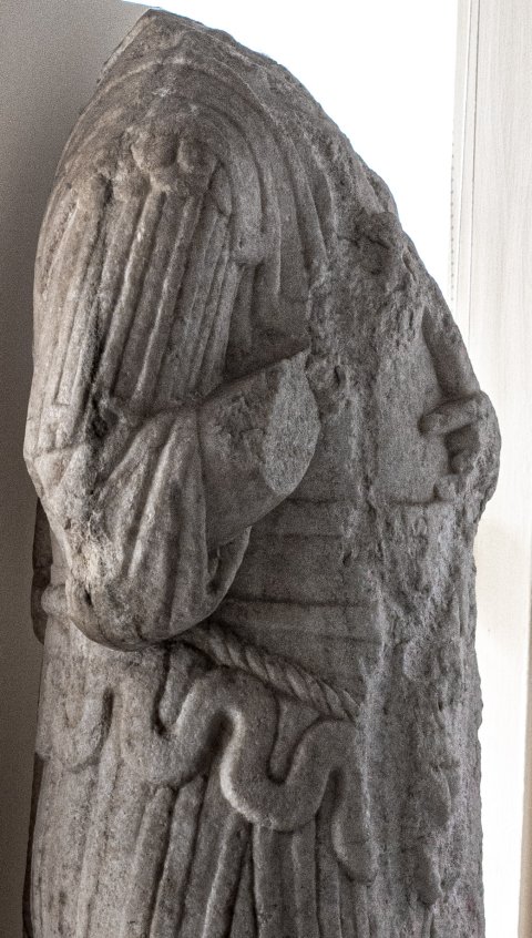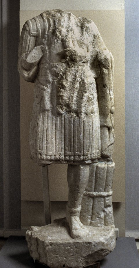 - Statue eines stehenden Mannes (Offizier, Centurio ?) : kurze Ärmeltunica, Panzer mit Schulterklappen, Pteryges und Streifenschurz, Offiziersbinde, Mantel über der linken Schulter, Sandalen, neben dem linken Fuß Bündel von Rollen, in der Linken Rolle (volumen).
