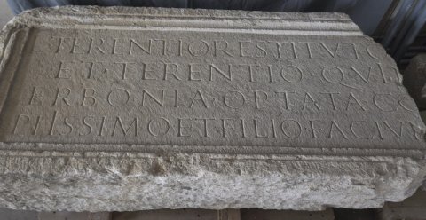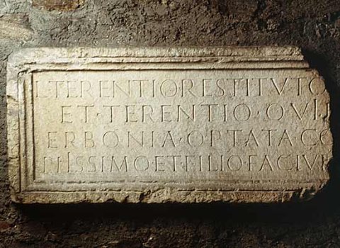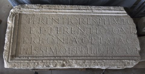 - L(ucio) Terentio Restituto [an(norum) ---?] / et Terentio Quie[to an(norum) ---?] / Erbonia Optata co[niugi] / piissimo et filio faciun[dum cur(avit)?]