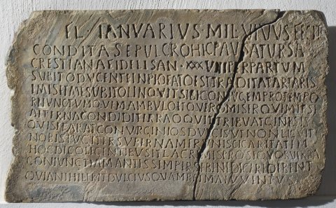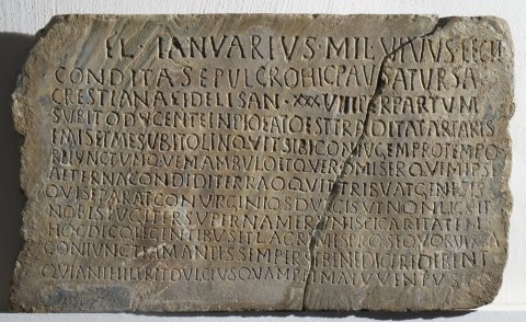 Fl(avius) Ianuarius mil(es) vivus fecit / condita sepulcro hic pausat Ursa /