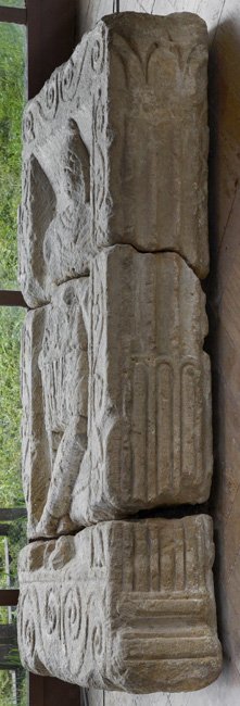 Auf der Stirnseite Pilaster mit profiliertem Sockel und kanneliertem Schaft, stilisiertes korinthisches Kapitell.