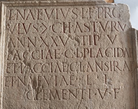 - L(ucius) Naevius L(ucii) f(ilius) Pro(c)/ulus (centurio) c(o)h(ortis) Asturu(m) / ann(orum) XXV stip(endiorum) V / Pacciae C(ai) l(ibertae) Placidae / et Pacciae C(aii) l(ibertae) Ansirae / et Naeviae L(ucii) l(ibertae) / Clementi(nae?) v(ivus) f(ecit)