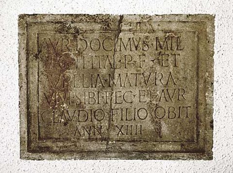 - Aur(elius) Docimus mil(es) / leg(ionis) II Ital(icae) p(iae) f(idelis) et / Aurelia Matura / vivi sibi fec(erunt) et Aur(elio) / Claudio filio obit(o) / ann(orum) XIIII
