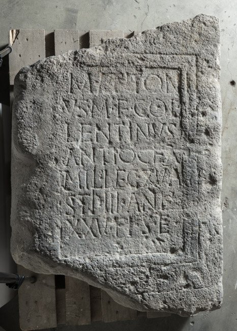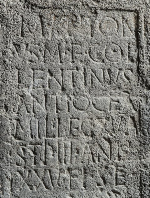 - M(arcus) Antoni/us M(arci) f(ilius) Col(lina) / Lentinus / Antiochia / mil(es) leg(ionis) XV A(pollinaris) / stip(endiorum) III ann(orum) XXV h(ic) s(itus) e(st)