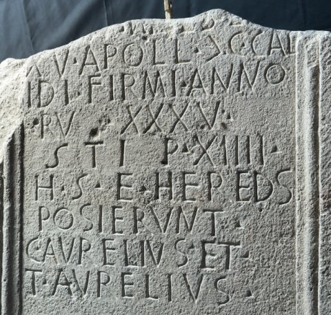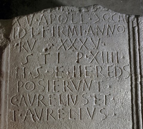 - ---] miles leg(ionis) / XV Apoll(inaris) (centuria) C(ai) Cal/id(i) Firmi anno/ru(m) XXXV / stip(endiorum) XIIII / h(ic) s(itus) e(st) hered(e)s / posierunt / C(aius) Aurelius et / T(itus) Aurelius