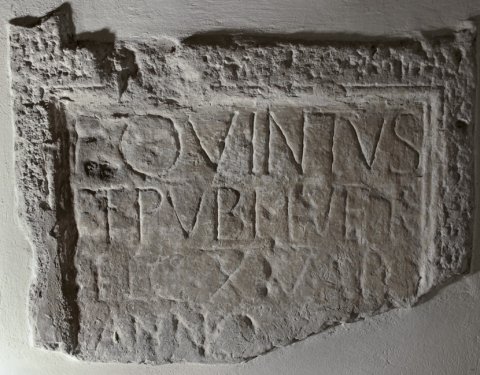 - P(ublius) Quint(i)us / P(ublii) f(ilius) Publi(lia) vet(e)r(anus) / leg(ionis) XV Apol(linaris) / anno(rum) LX[---] / [---