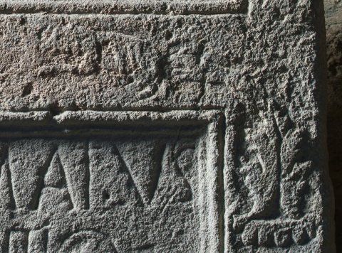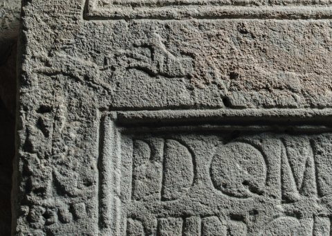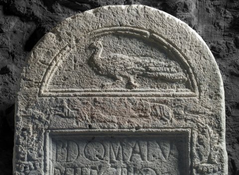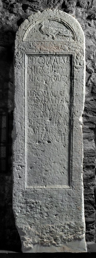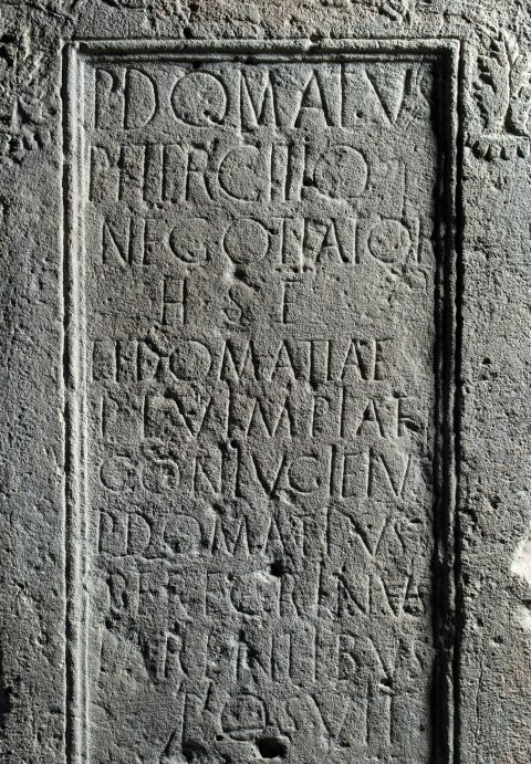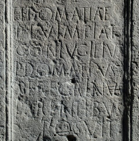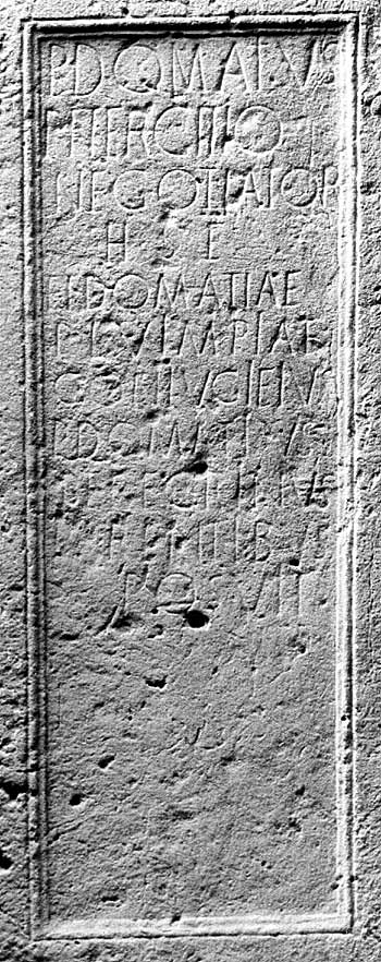 - P(ublius) Domatius / P(ublii) f(ilius) Tergitio / negotiator / h(ic) s(itus) e(st) / et Domatiae / P(ublii) l(ibertae) Vimpiae / coniugi eius / P(ublius) Domatius / Peregrinus / parentibus / posuit.